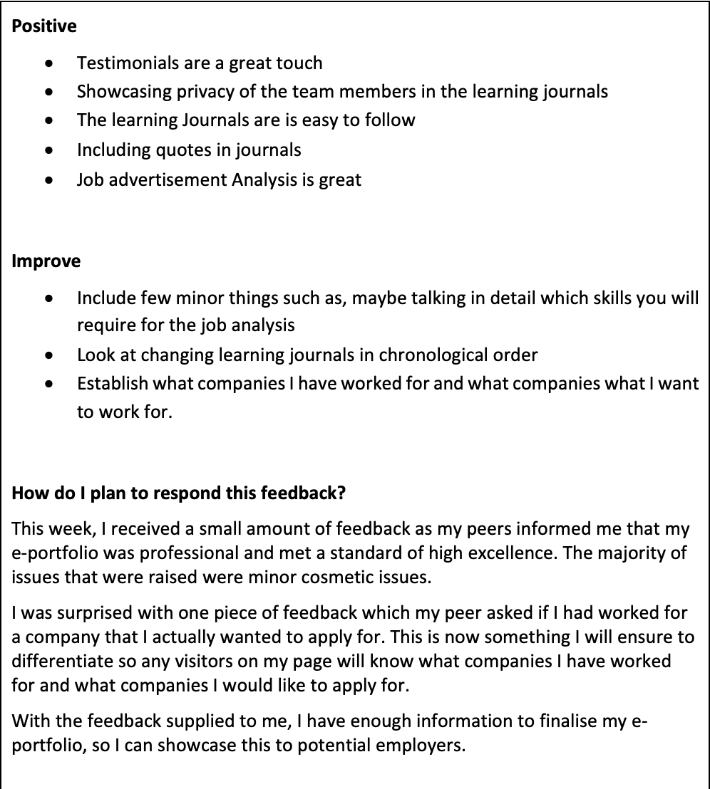 This feedback demonstrates why feedback is valuable as it allows someone such as myself to improve a current product in development. Feedback also generates new ideas that were not originally thought of. For example, one of my team members began her ‘about me’ section with a quote for an entrepreneur. This was something that caught my eye and has now been incorporated in my e-portfolio.